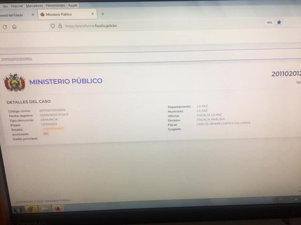 En el Sistema Judicial Libre se observa que la denuncia que presentó la diputada suplente de Comunidad Ciudadana, Luciana Michelle Campero Chávez, en contra del Ministro de Hidrocarburos y Energías, Franklin Molina Ortiz, fue desestimada, no fue admitida por falta de pruebas.