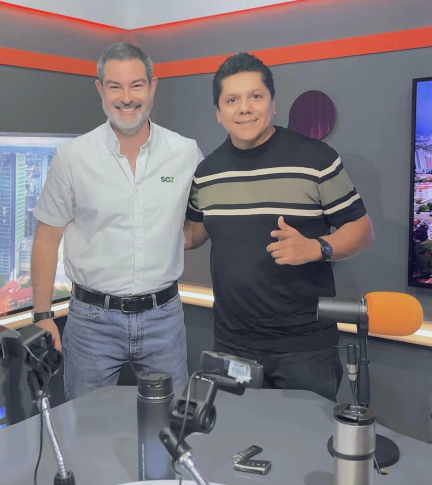 En la cabina de Radio Éxito Santa Cruz, con Caro TV y Raúl Mamani Montes. Un placer trabajar con ellos