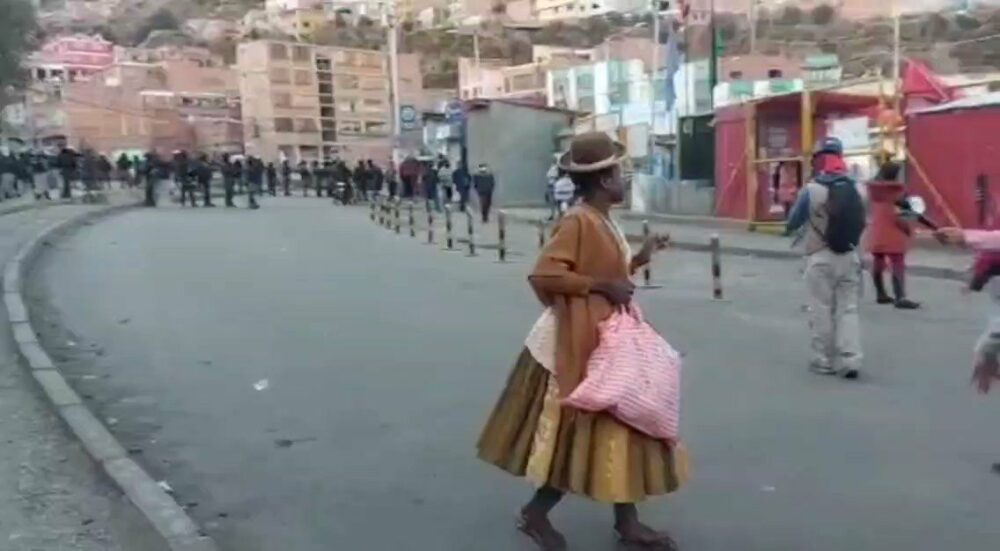 En medio del conflicto cocalero, la conocida manifestante Tomasa baila frente a la Policia. y pide que dejen pasar a la movilización. https://t.co/7JOQxMXSQ9