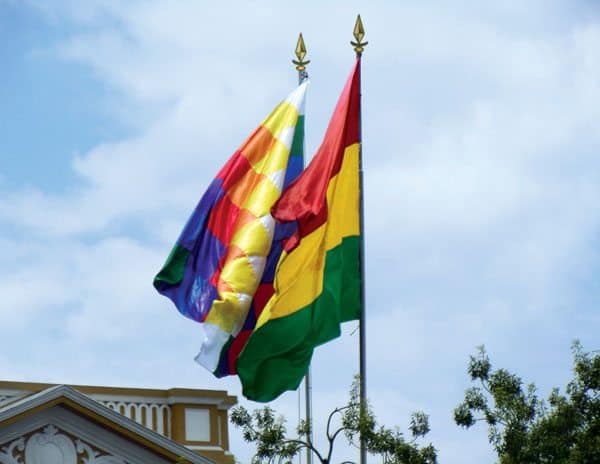 La wiphala es emblema de la resistencia para la liberación de los pueblos y la tricolor es el símbolo de la fundación de la república, juntas representan al Estado Plurinacional y a la unidad en la diversidad para enfrentar la adversidad