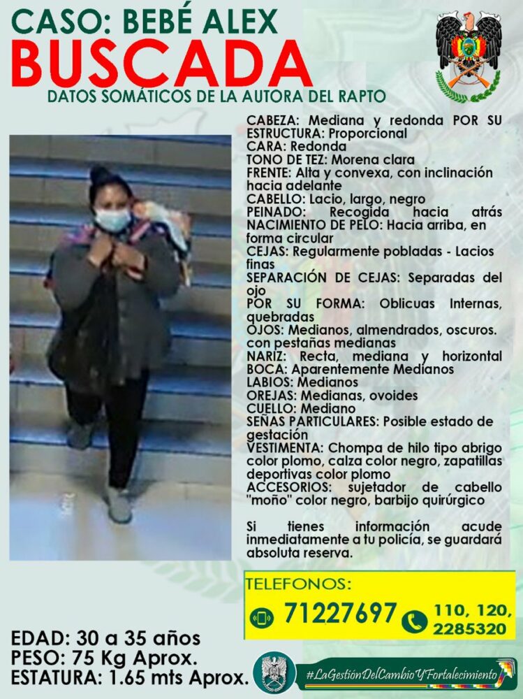 🔵 #ANF | #Seguridad La Policía difunde los datos somáticos de la mujer que raptó al bebé Alex, de tres meses, en la plaza Eguino, en la ciudad de #LaPaz. pic.twitter.com/hosDHwmh9v