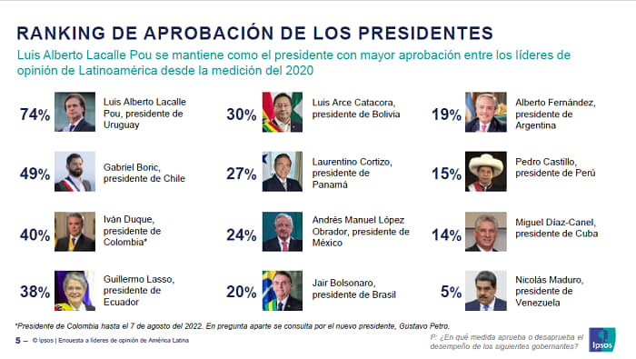 Luis Alberto Lacalle Pou, presidente de Uruguay, se ubica en el primer lugar del ranking de aprobación presidencial con 74% seguido por Gabriel Boric de Chile con 49%. Significativamente, Uruguay y Chile son los dos únicos países entre los evaluados que la mayoría considera democracias plenas.