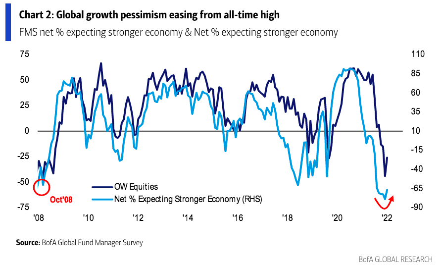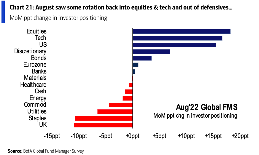 Las expectativas podrían estar puestas en la idea de que la inflación podría haber alcanzado ya su pico, que la recesión técnica podría ser relativamente corta y poco profunda, y de hecho esto también se refleja en el hecho de que los portafolios de inversión hayan estado adoptando posiciones nuevamente en renta variable growth, concretamente en tecnológicas del Nasdaq, a la vez que reduciéndolas en value de commodities y energéticas (probablemente por la extraordinaria explosión de precios que ha obligado a vender).