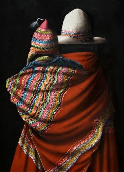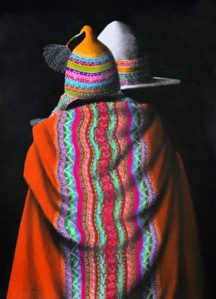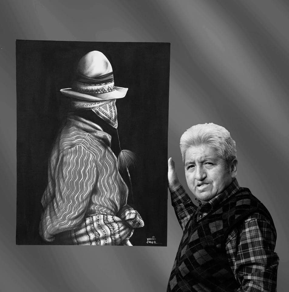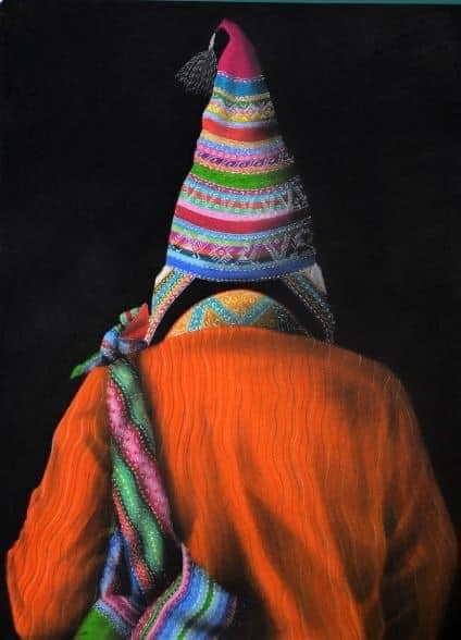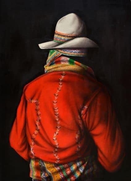 Eusebio Choque, uno de los artistas más emblemáticos del arte boliviano contemporáneo. Sus características obras retratan individuos con trajes típicos que le dan la espalda al espectador.