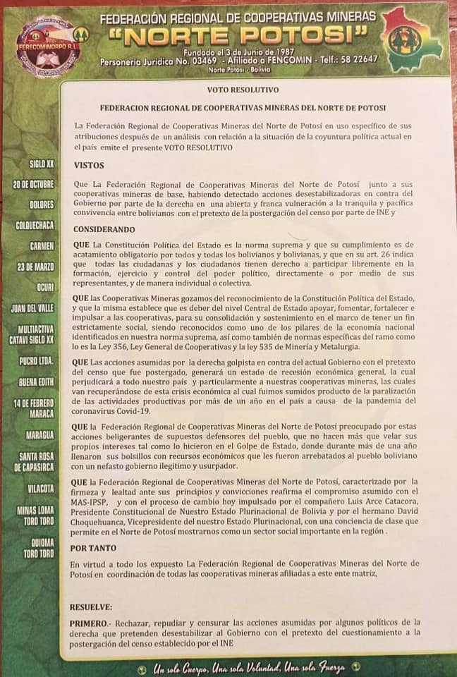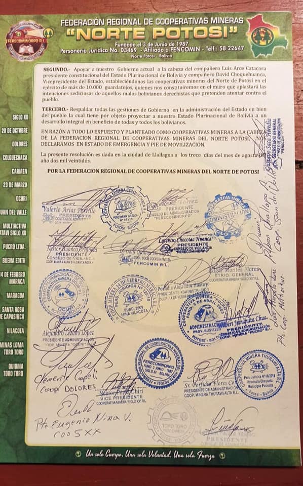 La Federación Regional de Cooperativas Minera Norte Potosí expresó su rechazo ante cualquier intento de desestabilización al Gobierno por parte de grupos de derecha. Además expresaron su respaldo al presidente Luis y al vicepresidente David Choquehuanca, afirmaron que permanecerán en estado de emergencia.