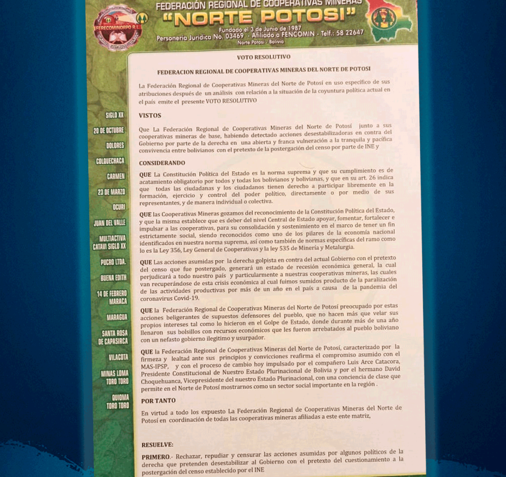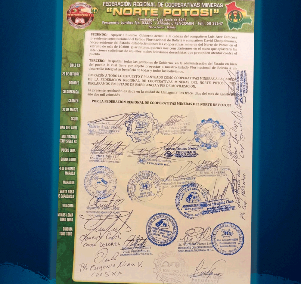 Recibir el respaldo de nuestra valerosa Federación Regional de Cooperativas Mineras del Norte de Potosí, cuna de mujeres y hombres revolucionarios, es sin duda un gran aliciente que fortalece nuestra lucha por construir un país con más justicia social.