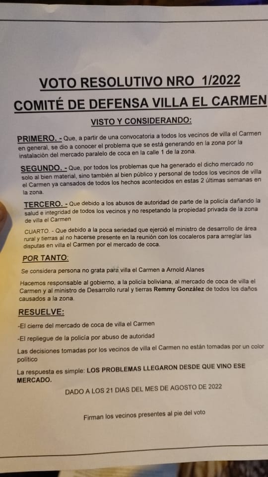 Asimismo emitieron un voto resolutivo para que se cierre el mercado de comercialización de coca que se aperturó en Villa El Carmen.