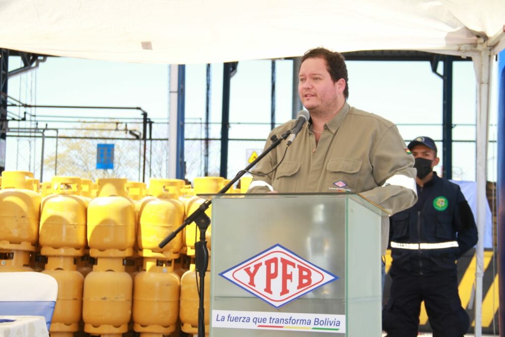 El ministro de Hidrocarburos y Energías, Franklin Molina y el presidente ejecutivo de YPFB, Armin Dorgathen Tapia, entregaron este martes 1.000 garrafas recalificadas a la Zona Comercial Bermejo