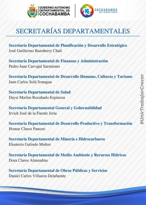 El Servicio Departamental de Cuencas pasa a denominarse Unidad de Cuencas, bajo la dependencia de la Secretaría Departamental de Medio Ambiente y Recursos Hídricos. En tanto que el Servicio Departamental de Gestión Social pasa a denominarse como Servicio Departamental de Políticas Sociales (Sedepos).