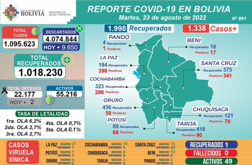 🔵 #ANF | El Ministerio de Salud reportó que el 23 de agosto se registraron 1.338 nuevos casos de #COVID19 en el país. Asimismo, a la fecha se acumulan 49 casos de #ViruelaSimica. pic.twitter.com/Ouj5rrUq9w