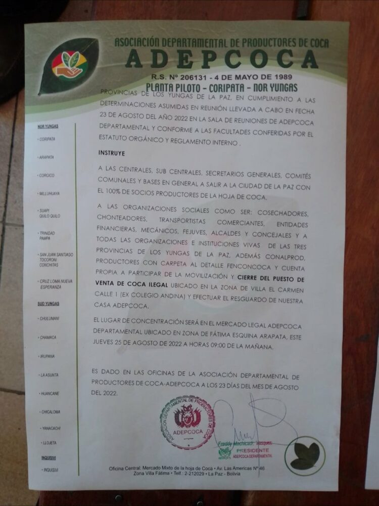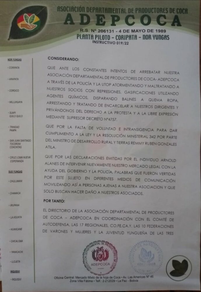 🔵 #ANF | El presidente de Adepcoca, Freddy Machicado, y el Comité de Autodefensa convoca los cocaleros de los Yungas a una concentración en el mercado de coca en la zona Villa Fátima a partir de esta noche porque existe el riesgo de que la sede cocalera sea tomada. pic.twitter.com/V4FNAUsxs2