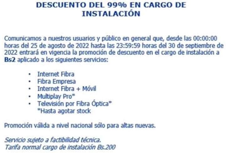 #RKC #ENTEL | Nueva promoción, ENTEL realizará instalaciones a costo de 2 Bs., Fibra Óptica Entel, para cliente final.