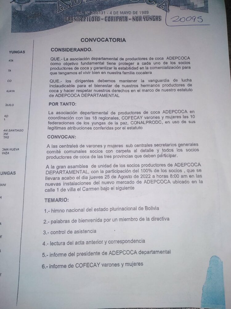 🔵 #ANF | #Sociedad Arnold Alanes emite convocatoria para una asamblea que se realizará este jueves en el mercado paralelo de coca instalado en la calle 1 de la zona Villa El Carmen, en #LaPaz. https://t.co/bkmCEd7SDP