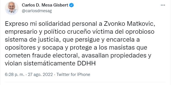 🔵#ANF | #Política El expresidente y líder de Comunidad Ciudadana (CC) @carlosdmesag, expresó su solidaridad con Zvonko Matkovic, aseguró que es víctima de un sistema judicial que persigue a opositores y protege a masistas. https://t.co/HrBbdVJDPG