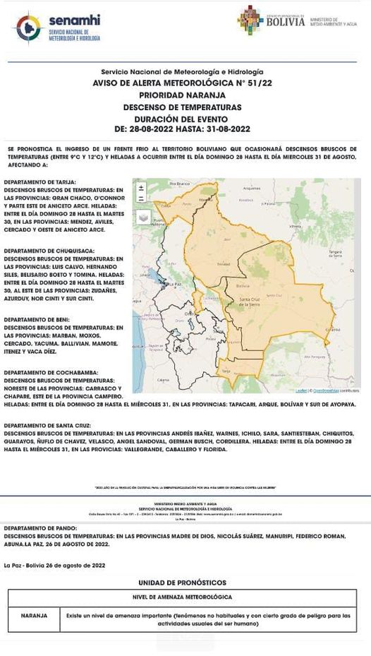 Los descensos bruscos de temperaturas afectarán a los departamentos de Chuquisaca, Santa Cruz, Beni, Pando, Cochabamba y Tarija.