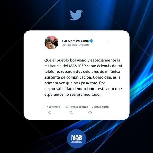 Evo Morales Ayma se dirige a la militancia del proceso de cambio y revela que no solo le robaron a él, su teléfono móvil, sino también a su asistente. “Esperamos que este acto no sea premeditado”, dijo el líder nacional del MAS-IPSP