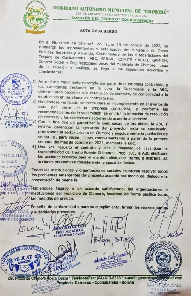 🔵 #ANF | Habitantes de Chimoré levantaron los bloqueos en la ruta #Cochabamba–#SantaCruz tras llegar a un acuerdo con el Gobierno que garantiza la continuidad de la construcción de la doble vía Puente Chimoré – Villa Tunari. pic.twitter.com/tDq0lNIIHt