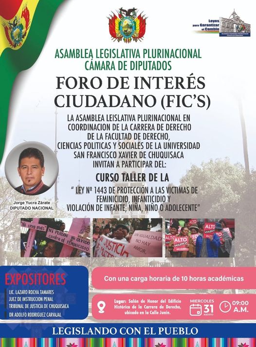 #Sucre: Éste miércoles la Asamblea Legislativa Plurinacional de la cámara de diputados realizará el foro de intereses ciudadanos en coordinación con la facultad de derecho de la USFXCH. En aplicación de la ley 1443, de protección a las víctimas de feminicidio, infanticidio y violación nin@ o adolescente, con la participación del diputado Jorge Yucra Z.