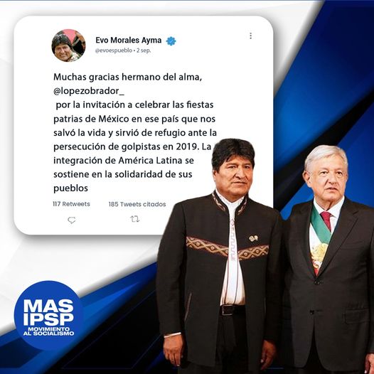 El líder del MAS-IPSP y expresidente Evo Morales Ayma agradece invitación del presidente de México, Andrés Manuel López Obrador #AMLO a celebrar actos por la independencia de ese país.