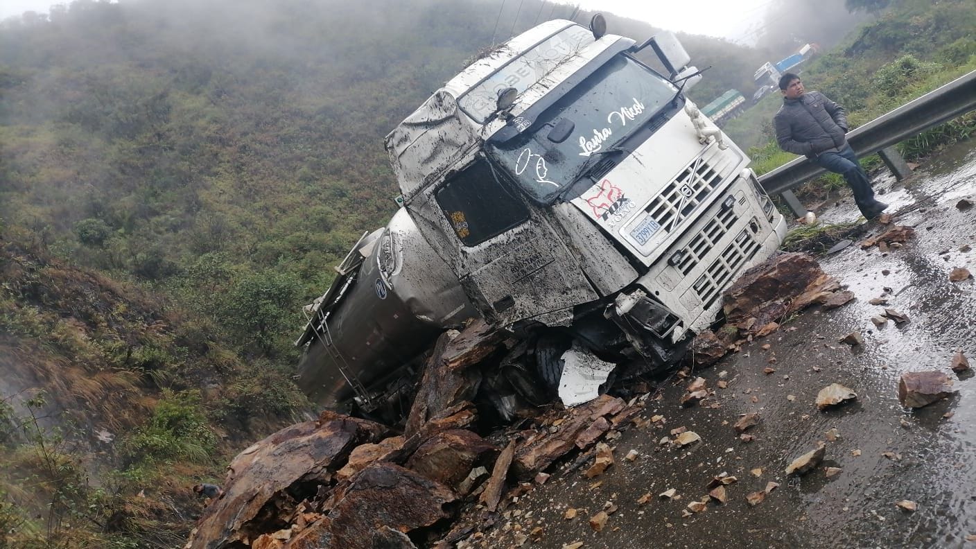 El camión terminó con graves daños y fuga de leche tras ser golpeado por las piedras que cayeron en la carrera Cochabamba-Santa Cruz, sector Locotal.