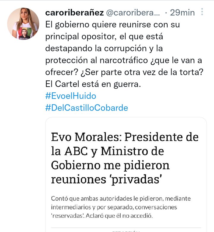 🔵 #ANF | @caroriberanez, hija de la expresidenta @JeanineAnez: «El Gobierno quiere reunirse con su principal opositor, el que está destapando la corrupción y la protección al narcotráfico ¿que le van a ofrecer? El Cartel está en guerra». https://t.co/jZ5nR3upvh