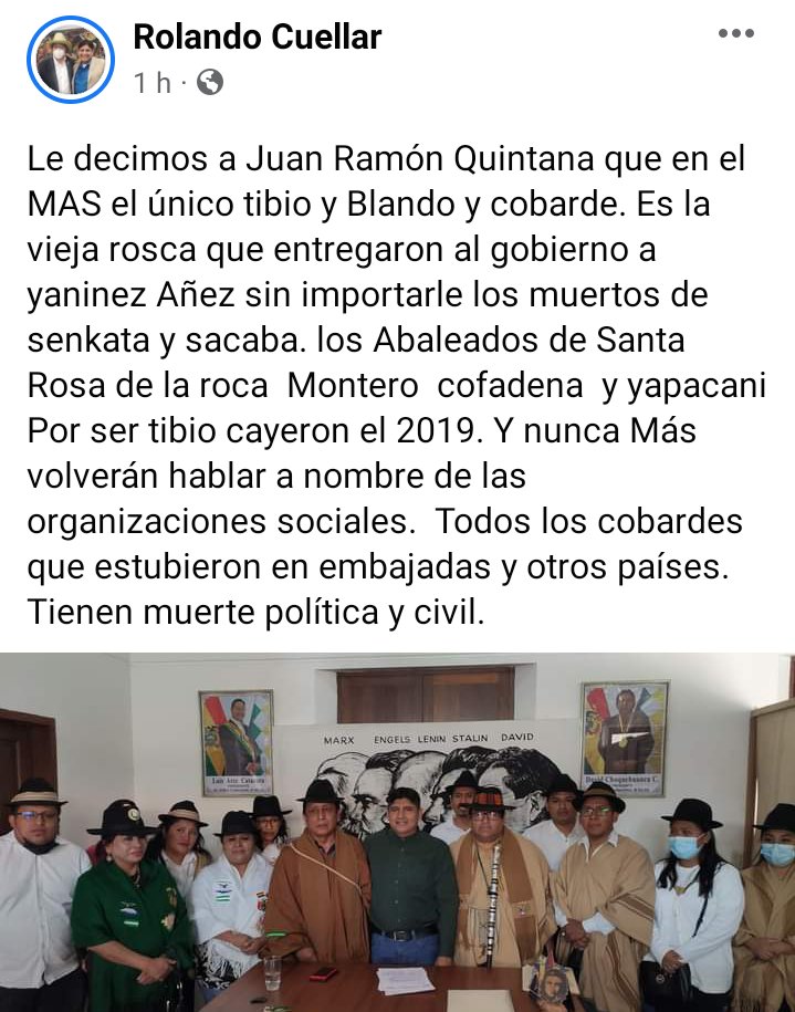 🔵 #ANF | Diputado del MAS Rolando Cuellar a Juan Ramón Quintana: «El único tibio, blando y cobarde en el MAS es la vieja rosca que entregó el gobierno a Jeanine Añez (…) Por ser tibios cayeron en 2019». https://t.co/pa8uDdrhGi
