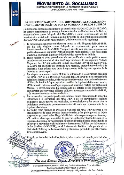 El MAS – IPSP, comunica a la opinión pública que el señor #HugoMoldiz no es dirigente de esta organización y ha estado usurpando funciones de vocería política en eventos internacionales. El presente documento es del 22 de junio del 2022.