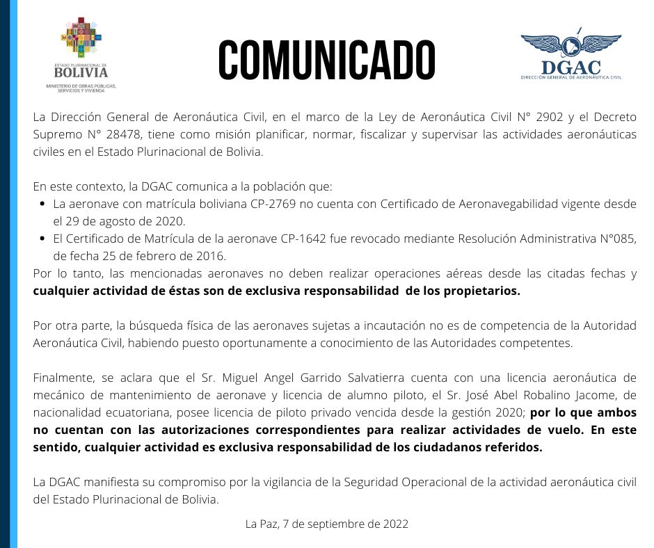 Desde la Dirección General de Aeronáutica Civil (DGAC), se informó en otro comunicado que la matrícula 2769 no cuenta con Certificado de Aeronavegabilidad desde agosto de 2020, mientras que en 2016 se revocó el Certificado de Matrícula 1642.