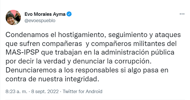 🔵 #ANF | Evo Morales dice que "compañeros militantes del MAS que trabajan en la administración pública" son hostigados y atacados por "decir la verdad y denunciar la corrupción". "Denunciaremos a los responsables si algo pasa en contra de nuestra integridad", tuiteó. pic.twitter.com/hBTkeTKviC