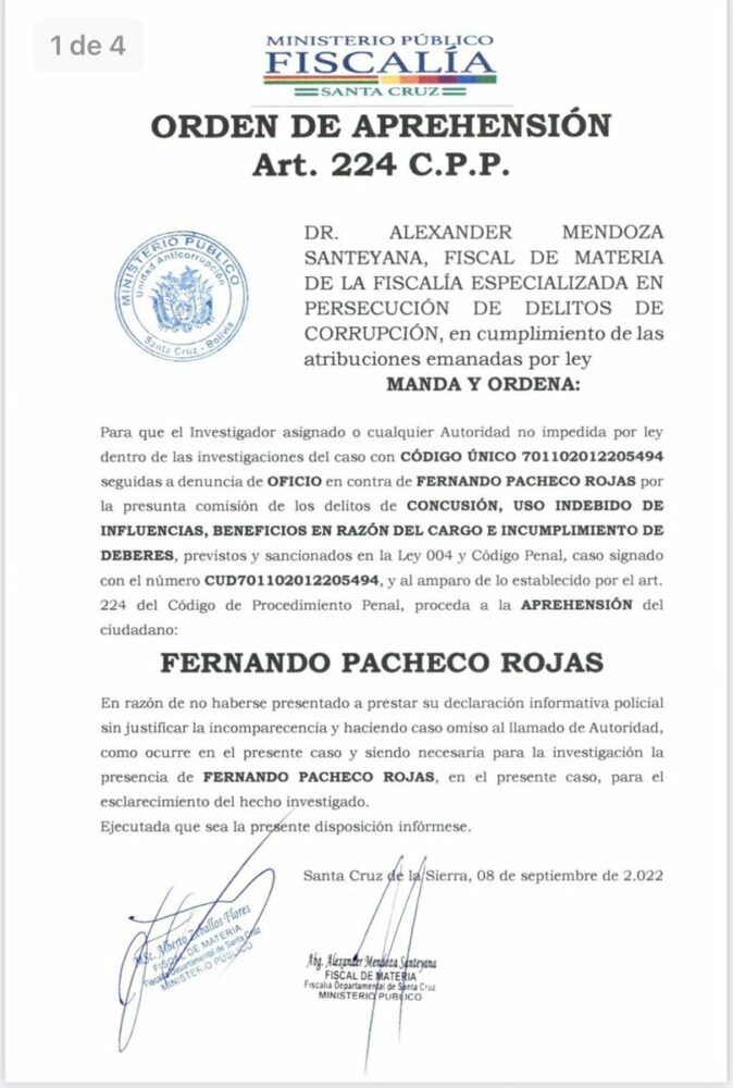 🔵 #ANF | #Seguridad La Fiscalía de #SantaCruz emite orden de aprehensión contra Fernando Pacheco, exsecretario de Salud, que fue implicado en hechos de corrupción. pic.twitter.com/a9FRlAvsuL