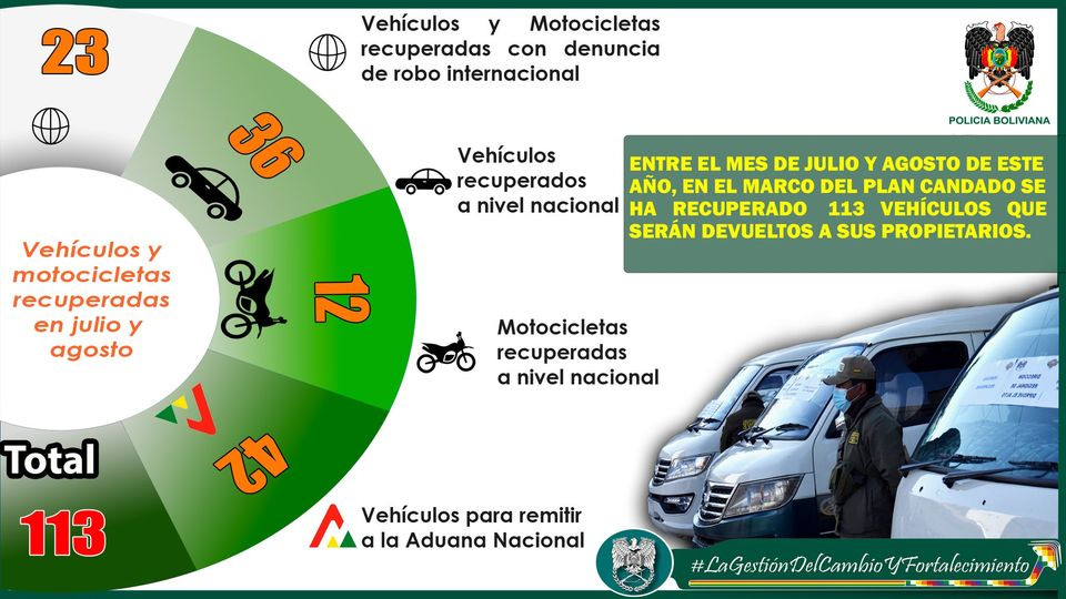 Desde la Policía se informó que en estos dos meses del “Plan Candado” se recobraron 36 vehículos, 12 motocicletas, 42 motorizados entregados a la AN y 23 que son de robos en el extranjero, en total son 113.