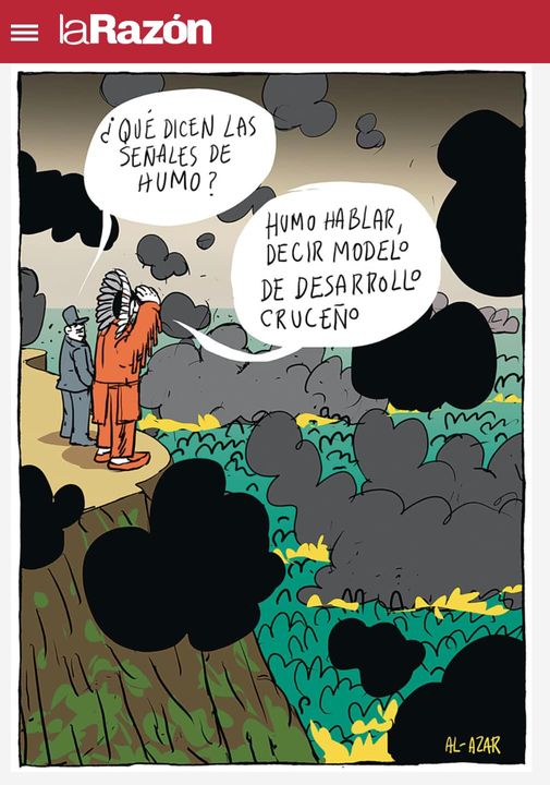 La Razón, con su caricatura del día, se estrella contra el modelo de desarrollo cruceño y lo culpa por las quemas y el humo.