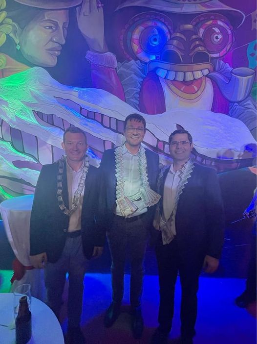 Los líderes empresariales cruceños abrazándose con La Paz. El gerente de la Expocruz, el presidente de Cainco y el presidente de la Federación de Empresarios de Santa Cruz en el stand de la Alcaldía de La Paz y adornados con motivos de las Alasitas