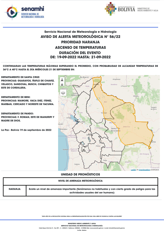 🔵 #ANF | #Sociedad El Servicio Nacional de Meteorología e Hidrología (Senamhi) emite una alerta por el ascenso de temperaturas que podrían llegar a los 40º en los departamentos de #SantaCruz, #Beni y #Pando. https://t.co/QDHF7uxasN