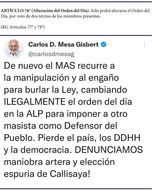 En un claro desconocimiento del reglamento de la asamblea legislativa plurinacional nacional el ex vicepresidente de Goni Sánchez de Lozada, Carlos Mesa, reaparece criticando la designación del defensor del pueblo.