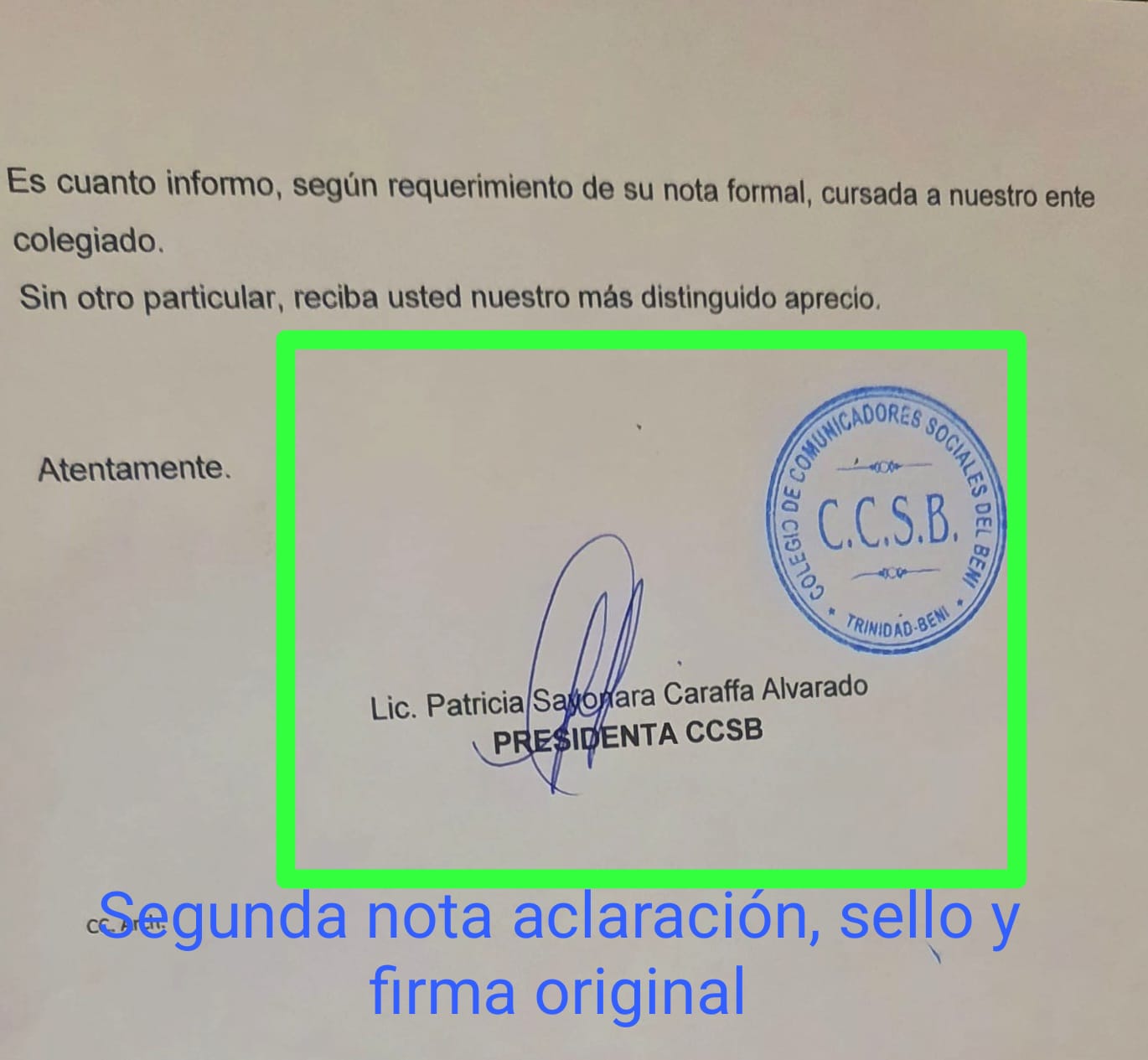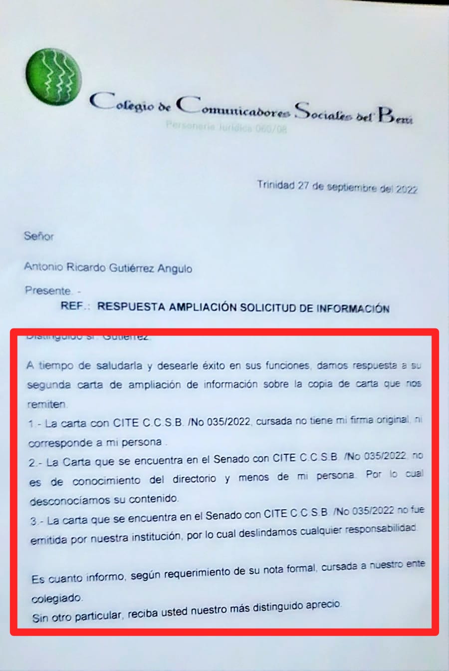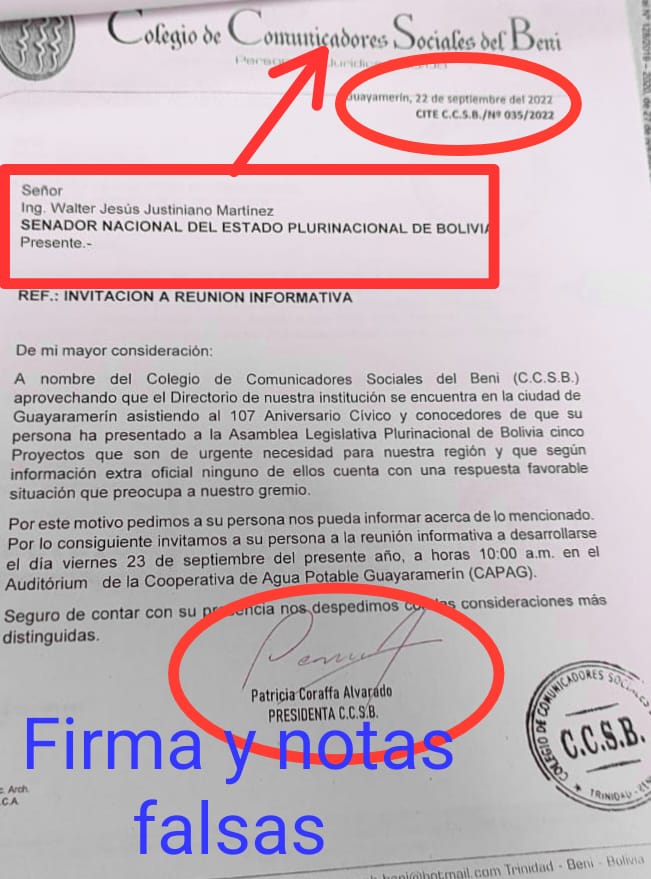 «El Senador de CC, Walter Justiniano Martínez, presentó una carta invitación del Colegio de Comunicadores Sociales del BENI y le otorgaron la licencia. El Colegio de de Comunicadores Sociales del BENI, niega rotundamente que haya enviado alguna invitación, esa invitación es FALSA!», indicó el exdiputado Amilcar Barral.