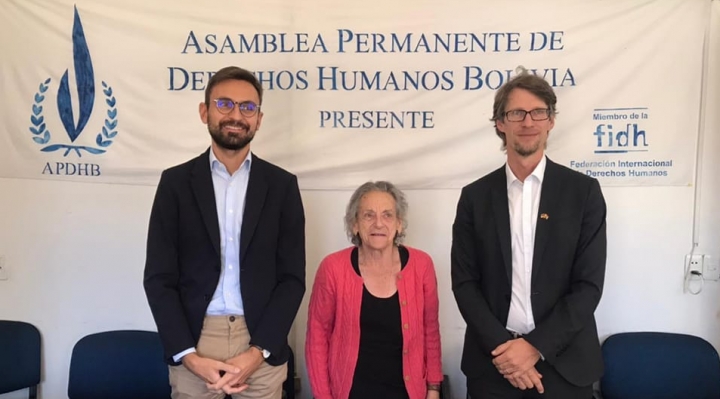 El Ministro Consejero de la Embajada de Alemania, Tarmo Dix junto a su colega de la Embajada de España, el ministro Consejero, Álvaro Vermoet, visitaron a la presidenta de la Asamblea Permanente de Derechos Humanos de Bolivia (APDHB), Amparo Carvajal.