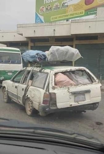 Dios! Qué marca es ese vehículo. Esta imagen es la mejor publicidad para esa marca. Debe tener más de 30 años de uso (seguramente intenso), resiste esa carga y sigue útil, rodando.