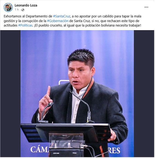 Senador Loza pide a #SCZ no usar el cabildo del viernes para «tapar mala gestión y corrupcion de la Gobernación»