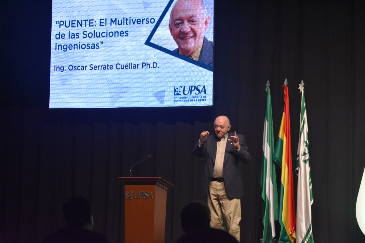 La conferencia Magistral “PUENTE: El Multiverso de las Soluciones Ingeniosas” destinada a empresarios y líderes institucionales la desarrolló el Decano de la Facultad de Ingeniería de la UPSA, Oscar Serrate Cuéllar.
