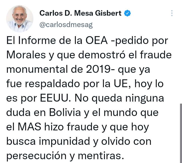 🔵 #ANF | Carlos Mesa acerca del informe del #EEUU sobre las Elecciones Generales de 2019: «No queda ninguna duda en #Bolivia y el mundo que el MAS hizo fraude y que hoy busca impunidad y olvido con persecución y mentiras». https://t.co/ID92imXkqf