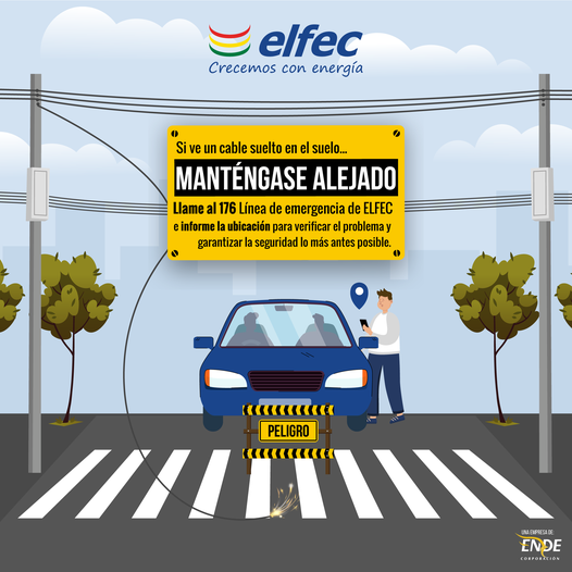ELFEC informa diversas situaciones pueden dar caída de cables en vías publicas si ve un cable suelto en el suelo puede recibir una descarga eléctrica y puede ser mortal, mantente alejado y evite también o otras personas se acerquen.