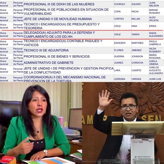 Exdefensora del pueblo interina, Nadia Cruz, figura en la actual lista de personal de planta del nuevo defensor Pedro Callisaya. Ocupara el cargo de Delegada Adjunto para la Defensa y Cumplimiento de Derechos Humanos.