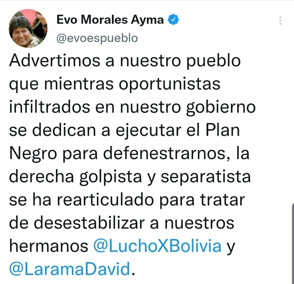 🔵 #ANF | Evo Morales ratifica la presencia de «infiltrados» en el Gobierno que promueven un «plan negro» para perjudicarlo. Acusa a la derecha de buscar la desestabilización de la gestión de Luis Arce y David Choquehuanca. https://t.co/WrFUVhBaq6