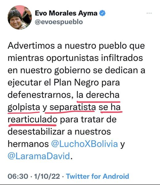 “La derecha golpista y separatista se ha rearticulado”: palabra de EvoCategorías NoticiasEtiquetas , Facebook, Pepe Pomacusi Periodista 01/10/2022 Fuente: Pepe Pomacusi Periodista