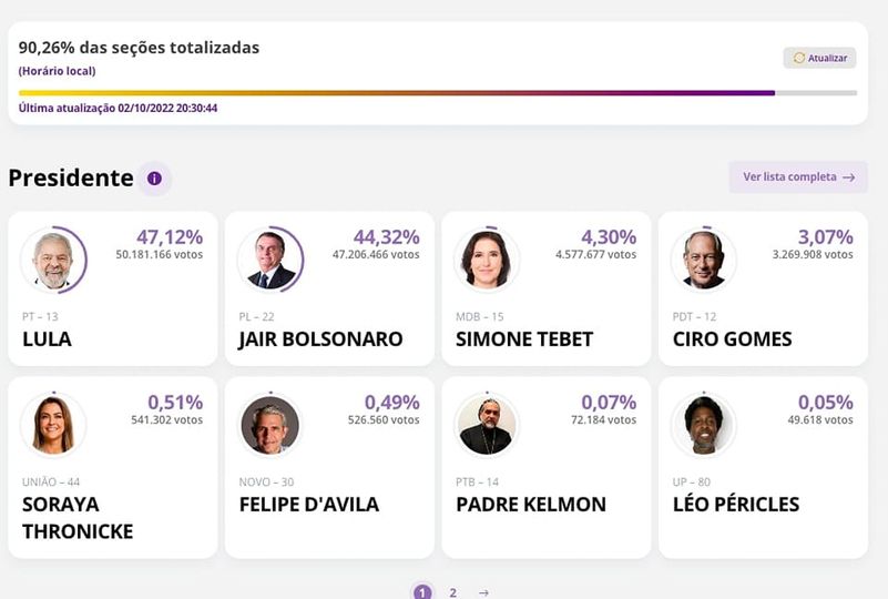 🇧🇷❗️Con un 90% de las mesas escrutadas Lula da Silva lidera los resultados de las elecciones en Brasil: ⚡️Lula (PT) 47,12% ⚡️Bolsonaro (PL) 44,32%