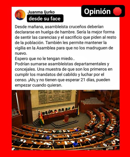 ¡ PUEDEN ARRANCAR YA ! 💪🏾 «Desde mañana, asambleístas cruceños deberían declararse en huelga de hambre… podrían sumarse asambleístas departamentales y concejales…» 🤔. ¿ SE ANIMARÁN ? Podés estar de acuerdo o no