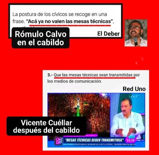 Tras la imponente poblada ante El Cristo donde el mismo comité cívico (foto) aseguró que ya no iban más las benditas mesas técnicas del gobierno, el rector «metió la pata» al poner ciertas condiciones para asistir a esas mesas técnicas (foto) – lo dijo un par de horas después del Cabildo – ¿ Quién los entiende ? 🤔