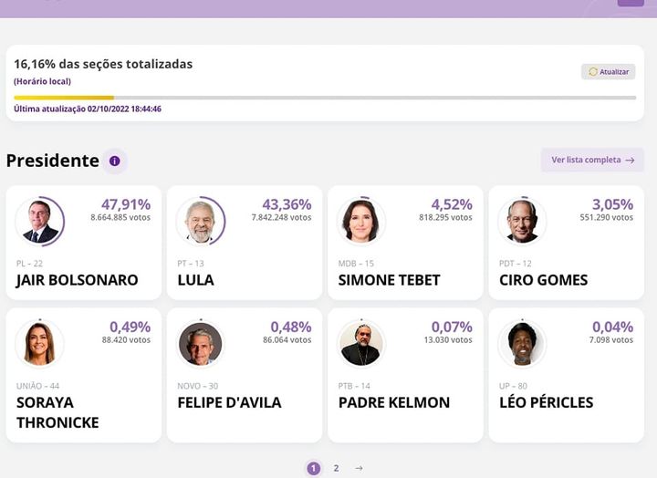 Brasil 🇧🇷❗️Con un 16,16% de los votos escrutados, el resultado en este momento da un 47,91% para Jair Bolsonaro y un 43,36% para Lula da Silva