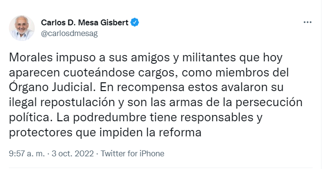 🔵 #ANF | @carlosdmesag acusa a Evo Morales de imponer a sus "amigos y militantes" que hoy aparecen "cuoteándose cargos como miembros del Órgano Judicial". "En recompensa estos avalaron su ilegal repostulación", tuiteó. pic.twitter.com/n5TVqdm010